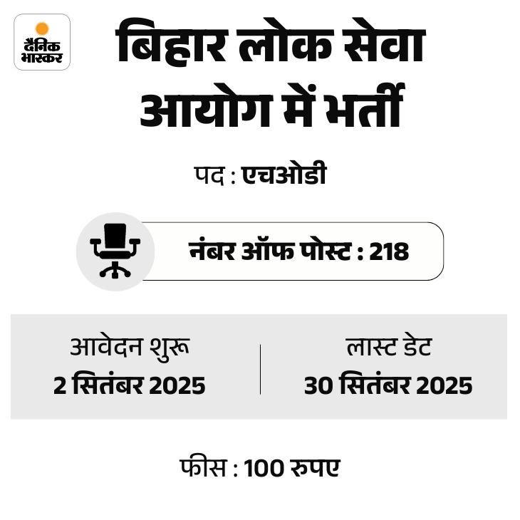 बिहार लोक सेवा आयोग ने राज्य के राजकीय पॉलिटेक्निक/राजकीय महिला पॉलिटेक्निक संस्थानों में विभागाध्यक्ष (एचओडी) के 218 पदों पर भर्ती निकाली है। ये भर्तियां अलग-अलग विभागों के लिए निकली हैं। उम्मीदवार ऑफिशियल वेबसाइट bpsc.bihar.gov.in पर जाकर अप्लाई कर सकते हैं।