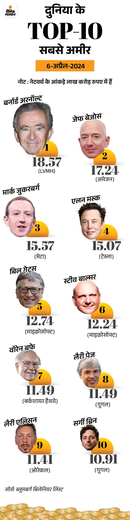 मार्क जुकरबर्ग की नेटवर्थ 187 बिलियन डॉलर (15.57 लाख करोड़ से ज्यादा) है। एलन मस्क की नेटवर्थ 181 बिलियन डॉलर (15.07 लाख करोड़ से ज्यादा) है। इस साल एलन मस्क की नेटवर्थ में 48.4 बिलियन डॉलर (4.03 लाख करोड़ से ज्यादा) की कमी आई। जुकरबर्ग ने अपनी संपत्ति में 58.9 बिलियन डॉलर (4.90 लाख करोड़ से ज्यादा) जोड़े हैं।