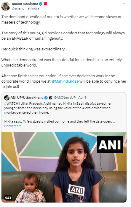 महिंद्रा ग्रुप के चेयरमैन आनंद महिंद्रा ने हाल ही में उत्तर प्रदेश के बस्ती जिले की 13 साल की निकिता को अपनी कंपनी में नौकरी करने का ऑफर दिया है। दरअसल, निकिता ने एलेक्सा (वर्चुअल असिस्टेंट) की मदद से अपने घर में घुसे बंदरों से अपनी और अपनी छोटी बहन की जान बचाई। घर में बंदरों के बाद निकिता ने अपनी सूझ-बूझ का इस्तेमाल किया और एलेक्सा को कुत्तों के भौंकने की आवाज निकालने को कहा।