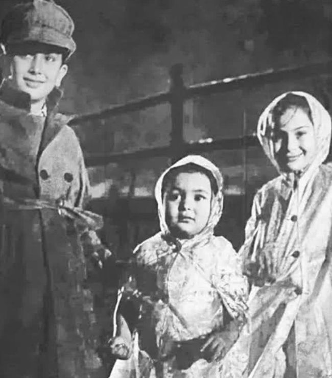 फिल्म श्री 420 के सेट पर ली गई ऋषि कपूर और उनके भाई-बहनों की तस्वीर।