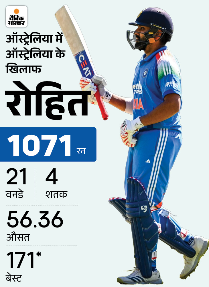 3. ऑस्ट्रेलिया के खिलाफ ऑस्ट्रेलिया में रोहित के 1000 वनडे रन पूरे रोहित शर्मा ने ऑस्ट्रेलिया के खिलाफ अपनी पारी में दूसरा रन लेते ही अनोखा रिकॉर्ड बना लिया। वे ऑस्ट्रेलिया के खिलाफ ऑस्ट्रेलिया में 1000 वनडे रन बनाने वाले भारत के पहले ही खिलाड़ी बने। उनके बाद कोहली ने 802 और सचिन ने 740 रन बनाए हैं।