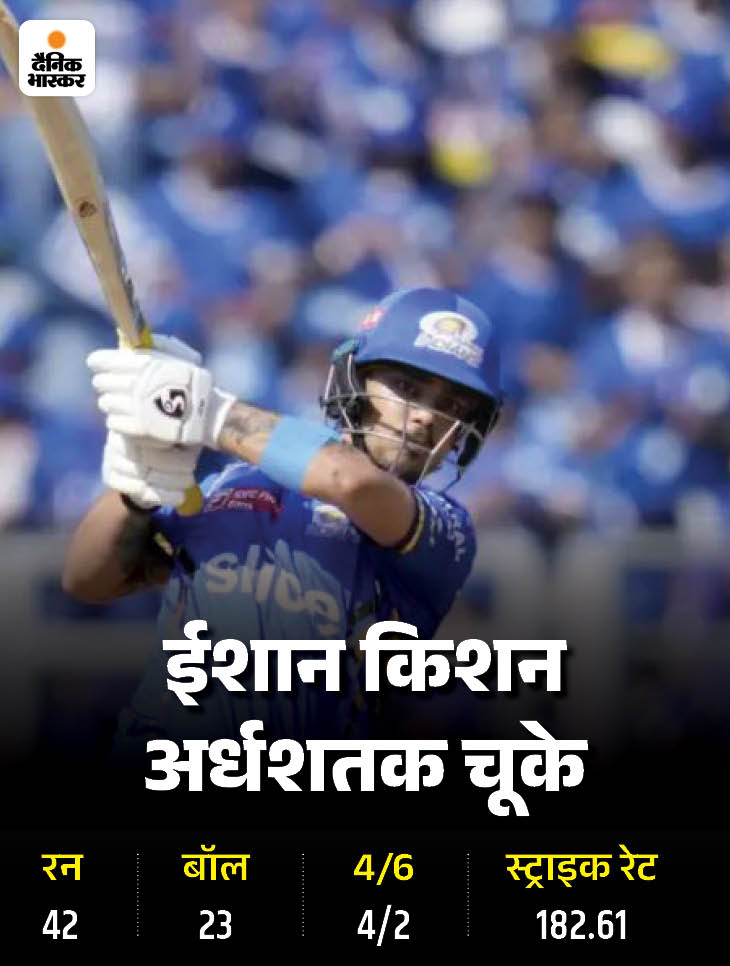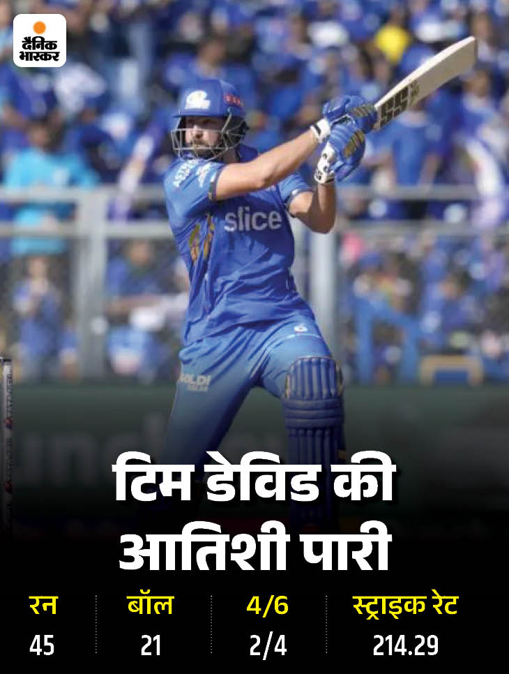 रोहित और ईशान किशन की जोड़ी ने पहले बल्लेबाजी करने उतरी मुंबई को मजबूत शुरुआत दिलाई। दोनों ने 42 बॉल पर 80 रन की ओपनिंग साझेदारी की। बीच में हार्दिक पंड्या और टिम डेविड ने 60 और रोमारियो शेफर्ड और टिम डेविड ने नाबाद 53 रन की साझेदारी की।