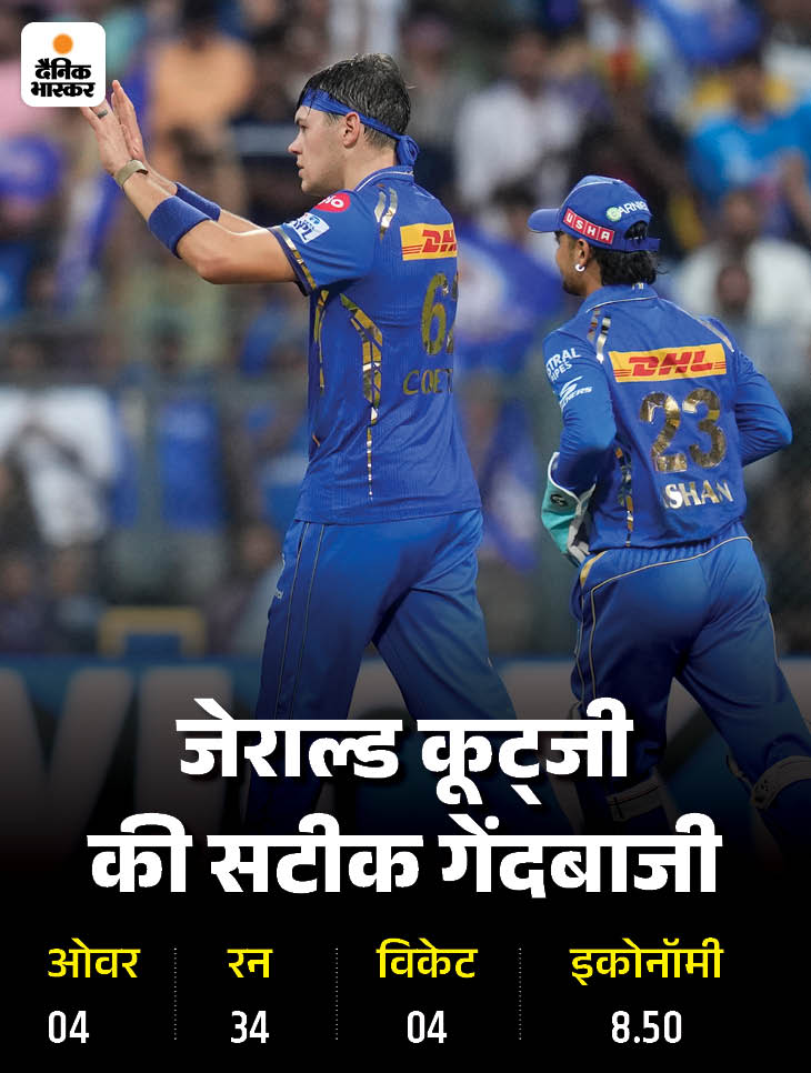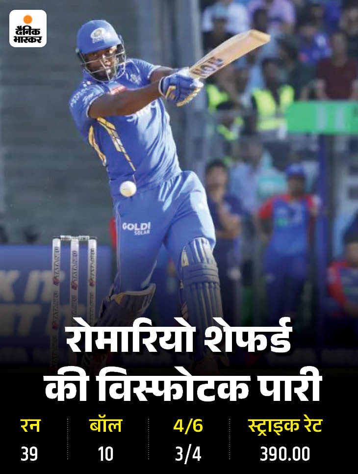 वानखेड़े स्टेडियम में रविवार को डबल हेडर के पहले मुकाबले में दिल्ली ने टॉस जीतकर गेंदबाजी चुनी। मुंबई ने पहले बल्लेबाजी करते हुए 20 ओवर में 5 विकेट पर 234 रन बनाए। जवाब में दिल्ली 20 ओवर में 8 विकेट पर 205 रन ही बना सकी। मुंबई के रोमारियो शेफर्ड प्लेयर ऑफ द मैच रहे। उन्होंने 10 बॉल पर 39 रन की पारी खेली और एक विकेट भी चटकाया।