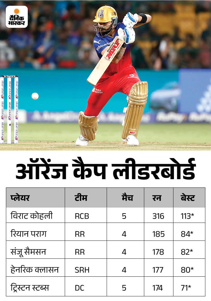 दिल्ली की ओर से नाबाद 71 रन बनाने वाले ट्रिस्टन स्टब्स ऑरेंज कैप की रेस में टॉप-5 में शामिल हो गए हैं। इस रेस में बेंगलुरु के विराट कोहली सबसे आगे हैं। कोहली 5 मैच में 316 रन बना चुके हैं।