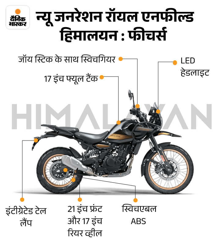 फीचर्स की बात करें तो न्यू जनरेशन हिमालयन 452 में इंटीग्रेटेड गूगल मैप्स, स्विचेबल रियर ABS, राइडिंग मोड्स, ऑल LED लाइटिंग सेटअप, रियर टेल लाइट्स के साथ 4 इंच का राउंड शेप्ड TFT इंस्ट्रूमेंट क्लस्टर मिलता है, जो टर्न इंडिकेटर्स के रूप में भी काम करता है। इसके अलावा हाइट एडजस्टेबल सीट दी गई है।