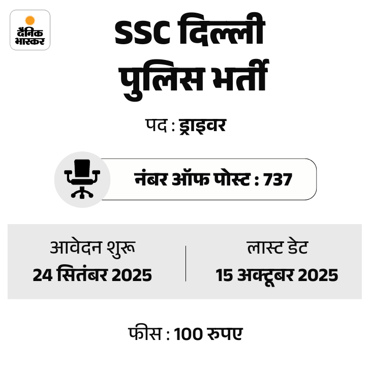 कर्मचारी चयन आयोग (SSC) ने एसएससी दिल्ली पुलिस में ड्राइवरों की भर्ती निकाली है। इस भर्ती के माध्यम से दिल्ली पुलिस में ड्राइवरों के 700 से ज्यादा पद भरे जाएंगे। उम्मीदवार ऑफिशियल वेबसाइट ssc.gov.in पर जाकर आवेदन कर सकते हैं।