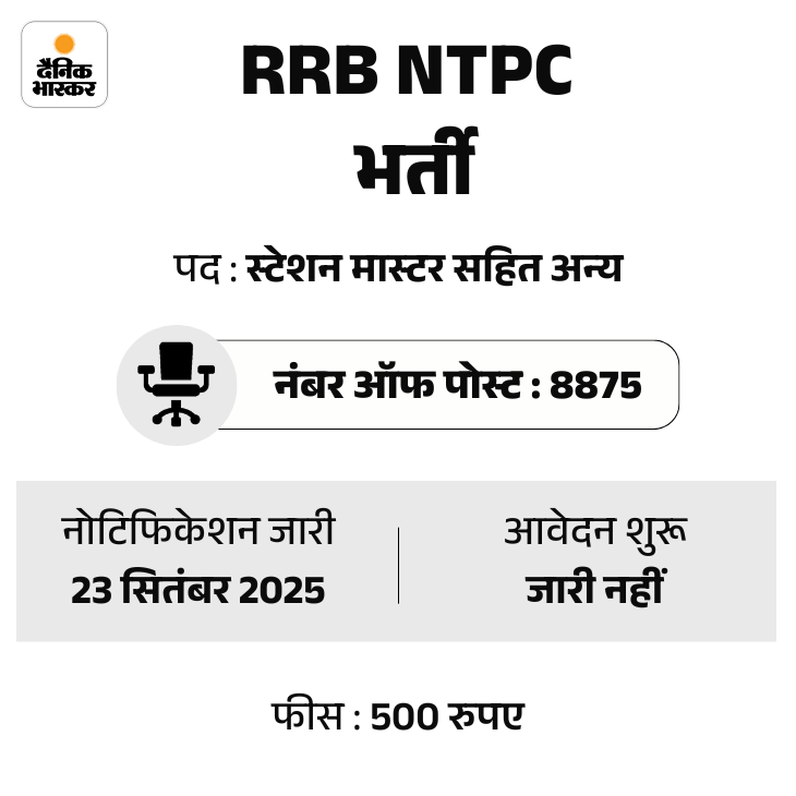 रेलवे भर्ती बोर्ड (RRB) की ओर से आरआरबी एनटीपीसी ग्रेजुएट और अंडर ग्रेजुएट के पदों पर भर्ती के लिए शॉर्ट नोटिफिकेशन जारी कर दिया गया है। आरआरबी एनटीपीसी ग्रेजुएट के लिए कुल 5817 पद और आरआरबी एनटीपीसी अंडर ग्रेजुएट के लिए कुल 3058 पद आरक्षित किए गए हैं। उम्मीदवार ऑफिशियल वेबसाइट rrbcdg.gov.in पर जाकर आवेदन कर सकते हैं।