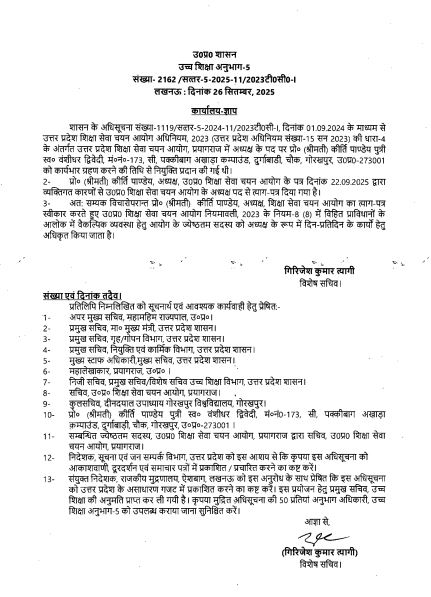 आज 26 सितंबर को इस्तीफा स्वीकार किया गया है। यूपी सरकार ने बेसिक शिक्षा से लेकर माध्यमिक और उच्च शिक्षा विभाग में शिक्षकों की भर्ती के लिए 23 अगस्त 2023 को यह आयोग बनाया था।