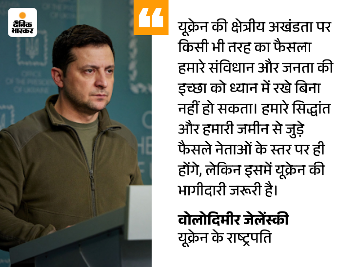 जेलेंस्की ने कहा कि यूक्रेन की जमीन के बारे में कोई भी फैसला बिना यूक्रेन की सहमति के नहीं हो सकता। मेरी पोजिशन नहीं बदलेगी। एक दिन पहले भी उन्होंने कहा था कि उनके पास अपनी देश की जमीन छोड़ने का कोई अधिकार नहीं है।