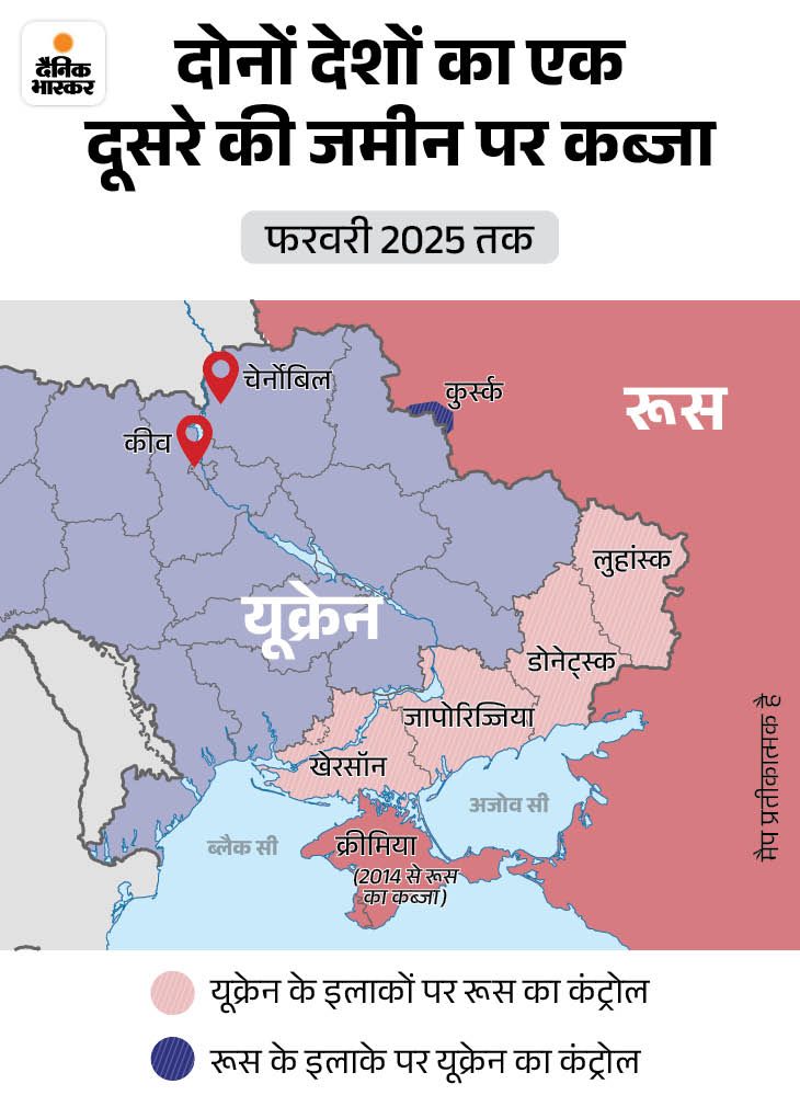 फरवरी 2025 तक यूक्रेन और रूस के कंट्रोल वाले इलाके।