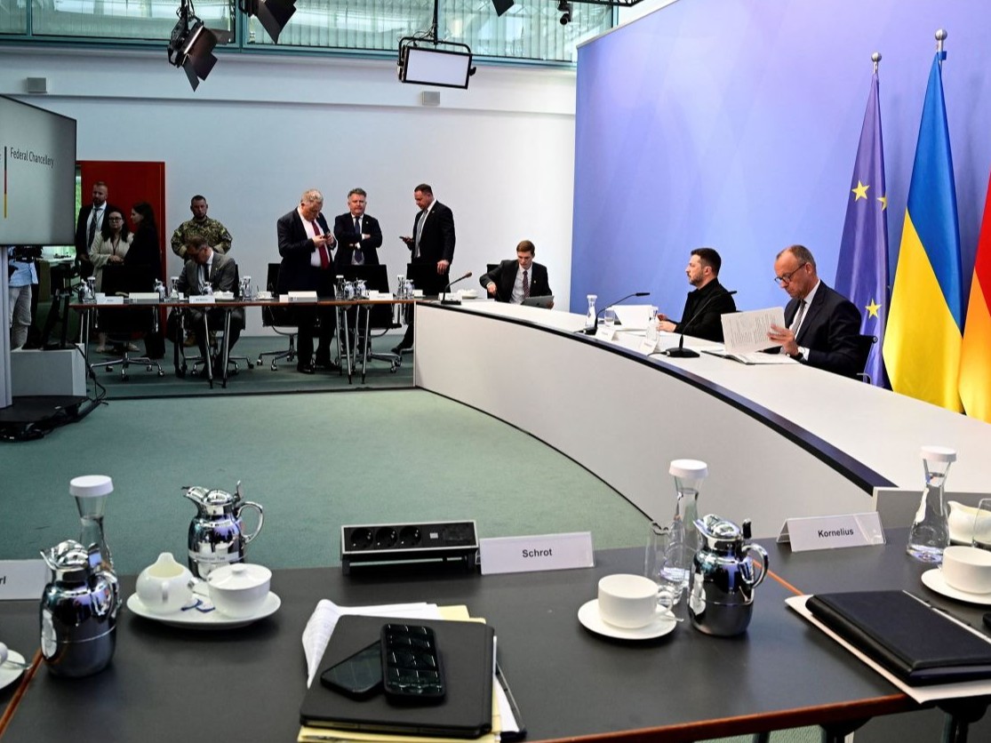 वर्चुअल बैठक के दौरान जर्मन चांसलर फेडरिक मर्त्ज के साथ जेलेंस्की।