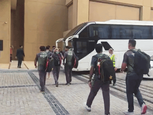 होटल से दुबई स्टेडियम के लिए निकलते हुए पाकिस्तानी खिलाड़ी।