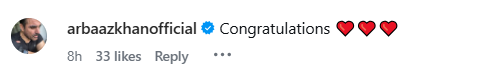 अरबाज खान ने भी भांजे की पोस्ट पर लिखा, मुबारक हो।मलाइका अरोड़ा ने भी पूर्व पति अरबाज खान के भांजे की पोस्ट में लिखा है, यानी टीना।