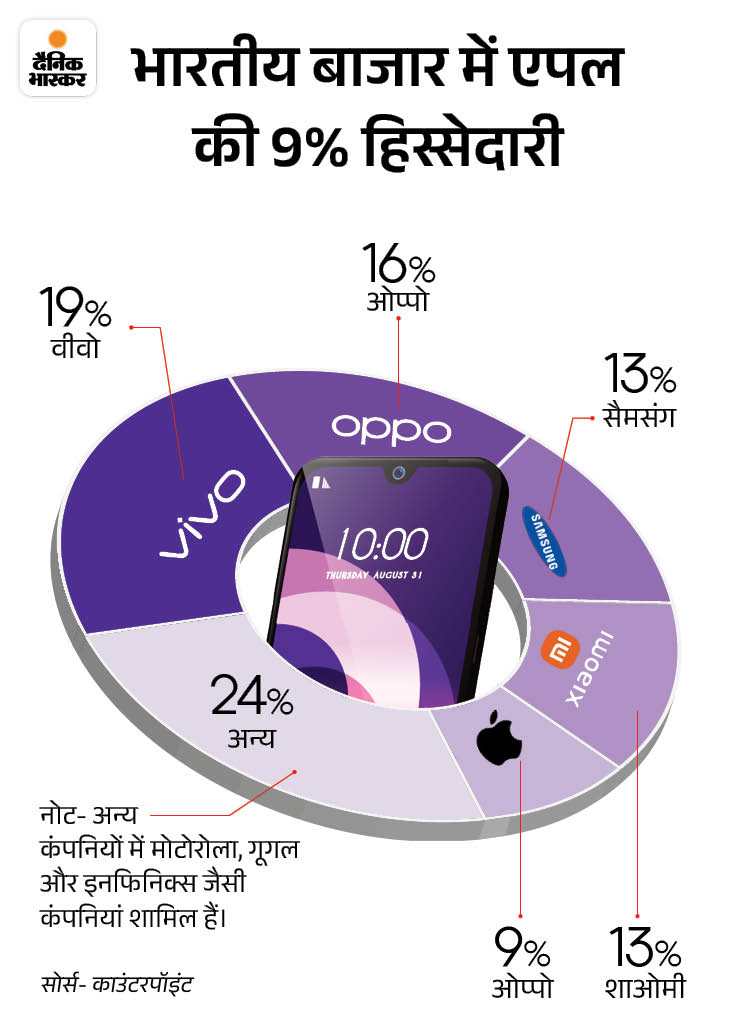 एपल के लिए भारत लगातार महत्वपूर्ण बाजार के रूप में उभरा है। मार्केट ट्रैकर IDC के अनुसार, 2025 में कंपनी देश में 15 करोड़ आईफोन बेच सकती है। इससे एपल का मार्केट शेयर पहली बार 10% से ऊपर जा सकता है।