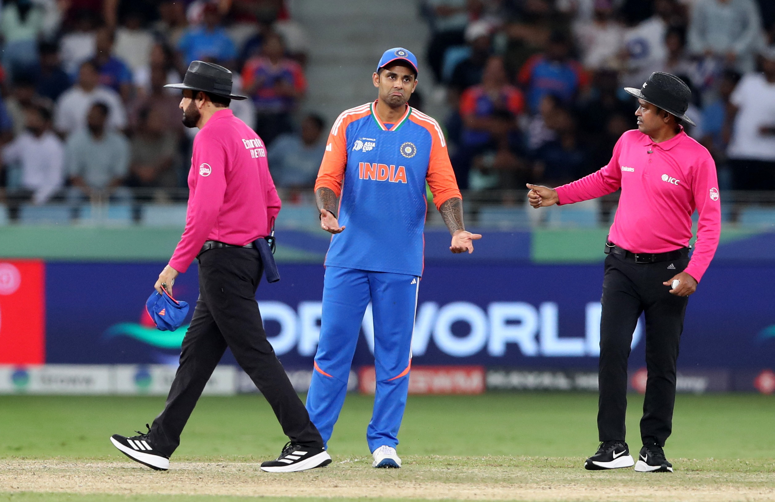 शनाका को नॉट आउट देने के बाद सूर्यकुमार को अंपायर समझाते हुए।