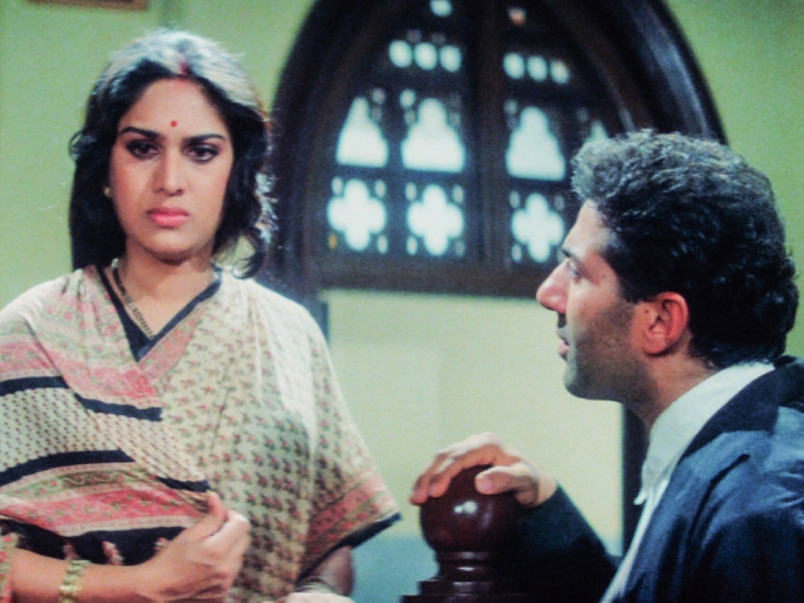 फिल्म ‘दामिनी’ के एक सीन में वकील के रूप में सनी देओल और दामिनी के किरदार में मीनाक्षी शेषाद्री।