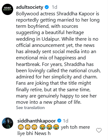 सिद्धांत ने इंस्टाग्राम पर वायरल हो रही एक पोस्ट के कमेंट सेक्शन में हैरानी और हंसी वाले इमोजी के साथ लिखा, “ये तो मेरे लिए भी न्यूज है।”