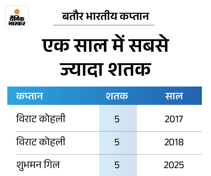 3. गिल ने कोहली के रिकॉर्ड की बराबरी की कप्तान शुभमन गिल ने एक कैलेंडर ईयर में सबसे ज्यादा टेस्ट शतक में विराट कोहली की बराबरी कर ली। गिल ने 2025 में बतौर कप्तान पांचवां शतक लगाया। विराट ने 2017 और 2018 में दो बार एक साल में 5-5 टेस्ट शतक लगाए थे।