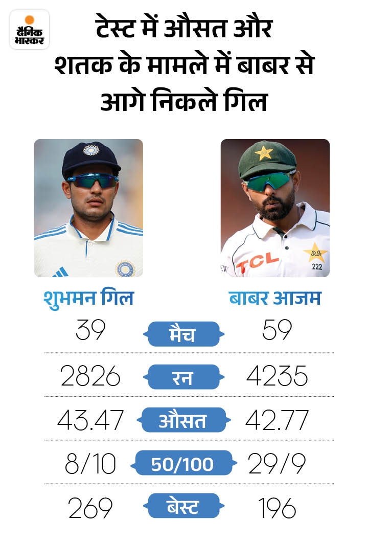 शुभमन ने अब तक 39 टेस्ट में 43.47 की औसत से 2826 रन बनाए हैं, जिसमें 10 शतक शामिल हैं। वहीं, बाबर आजम ने 59 टेस्ट में 42.77 की औसत से 4235 रन बनाए हैं, लेकिन उनके खाते में 9 शतक ही हैं।