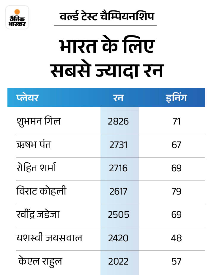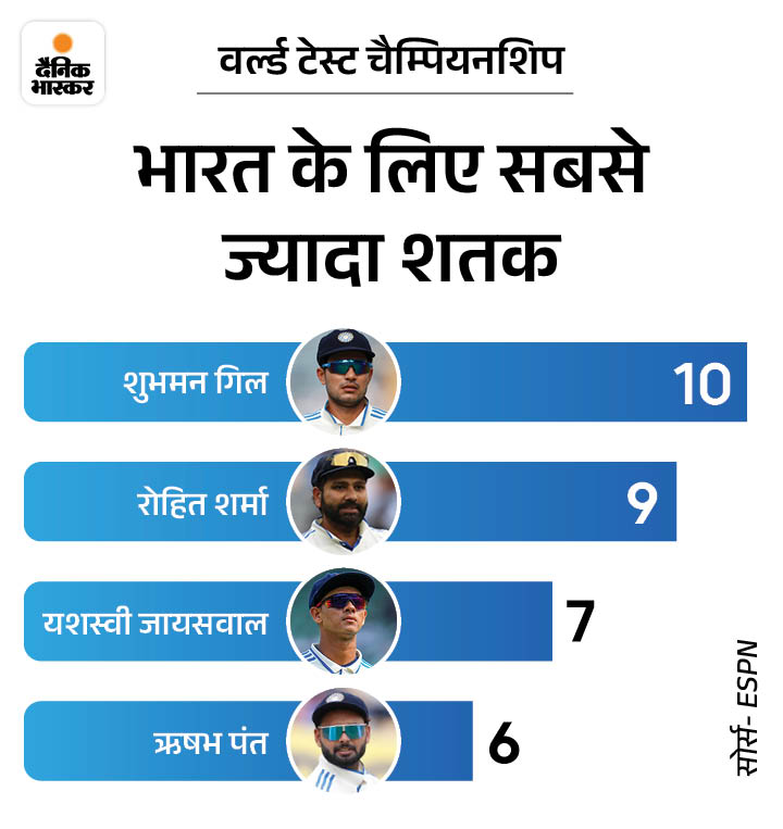 4. WTC में गिल सबसे ज्यादा रन बनाने वाले भारतीय शुभमन गिल वर्ल्ड टेस्ट चैम्पियनशिप में भारत के लिए सबसे ज्यादा रन बनाने वाले बल्लेबाज बन गए हैं। गिल ने अब तक 71 पारियों में 2826 रन बना लिए। उन्होंने ऋषभ पंत (67 पारियों में 2731 रन) और रोहित शर्मा (69 पारियों में 2716 रन) जैसे दिग्गजों को पीछे छोड़ते हुए पहला स्थान हासिल किया।