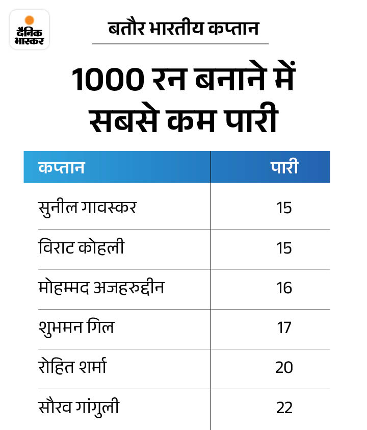 5. गिल चौथे सबसे तेज 1000 रन बनाने वाले भारतीय कप्तान शुभमन गिल बतौर कप्तान इंटरनेशनल क्रिकेट में सबसे तेज 1000 रन बनाने वाले चौथे भारतीय बने। गिल ने यह मुकाम अपनी 17वीं पारी में हासिल किया। रिकॉर्ड में पहले नंबर पर सुनील गावस्कर और विराट कोहली हैं। दोनों ने 15-15 पारियों में एक हजार रन बना लिए थे।
