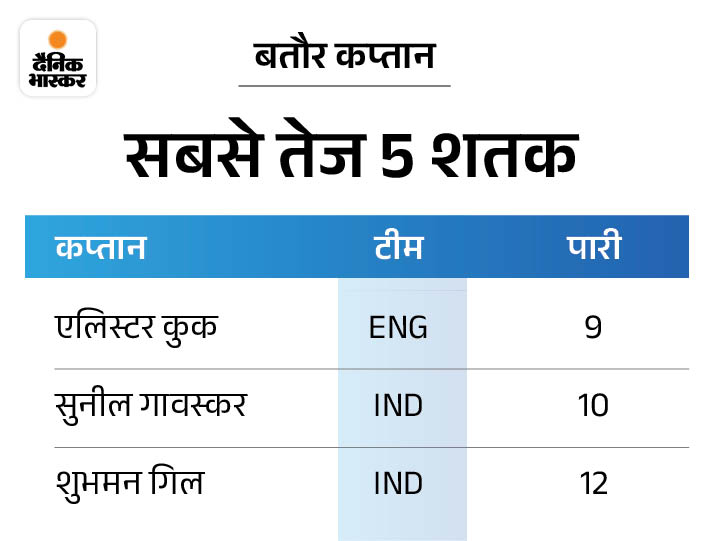 6. गिल ने 12 इनिंग में 5वां टेस्ट शतक लगाया शुभमन गिल बतौर कप्तान सबसे तेज 5 टेस्ट शतक लगाने वाले दुनिया के तीसरे बल्लेबाज बन गए। उन्होंने पांचवां शतक अपनी 12वीं पारी में ही लगा दिया। इस मामले में गिल इंग्लैंड के एलिस्टर कुक (9 इनिंग) और भारत के सुनील गावस्कर (10 इनिंग) से ही पीछे रहे।