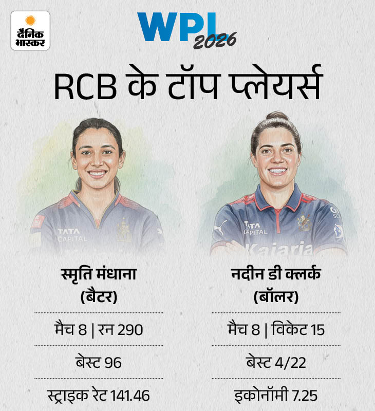 RCB की कप्तान स्मृति ने अब तक इस सीजन में 8 मैचों में 48.33 के औसत से कुल 290 रन बनाए हैं और वे अभी तीसरे नंबर पर हैं। इस लिस्ट में पहली पोजिशन पर मुंबई इंडियंस की कप्तान हरमनप्रीत कौर हैं, जिन्होंने 342 रन बनाए हैं। ऐसे में स्मृति को उन्हें पीछे छोड़ने के लिए फाइनल मैच में 53 रन और बनाने होंगे। स्मृति RCB की टॉप स्कोरर हैं। बॉलिंग में नदीन डी क्लर्क टॉप पर हैं।