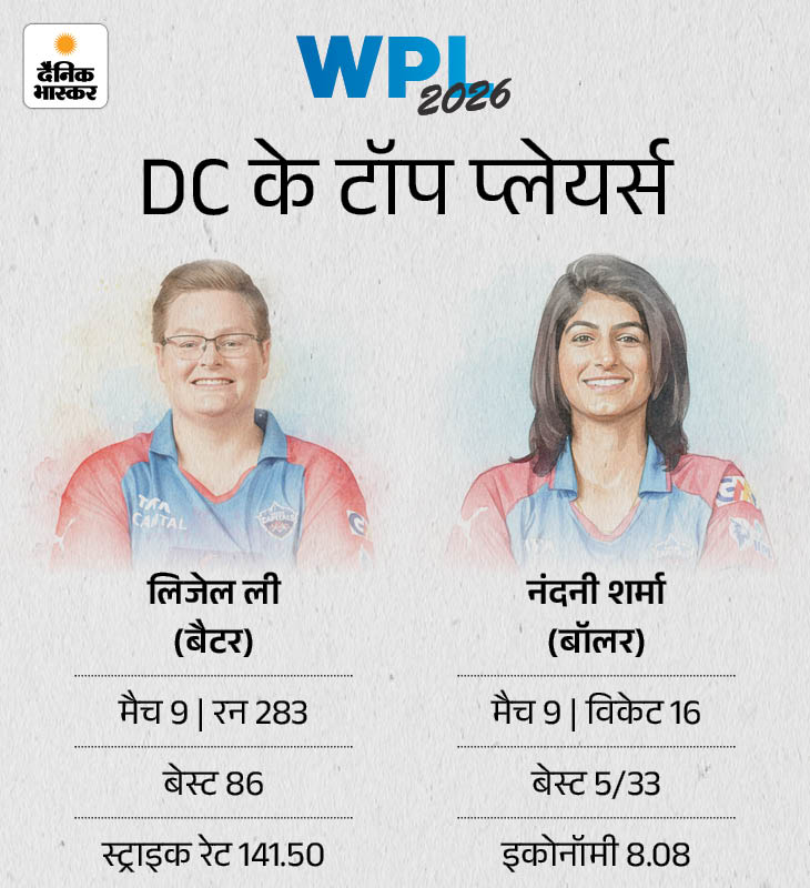 दिल्ली कैपिटल्स की गेंदबाज नंदिनी शर्मा पर्पल कैप की रेस में दूसरे नंबर पर हैं। गुजरात जायंट्स की सोफी डिवाइन 17 विकेट के साथ टॉप पर हैं। नंदनी के अभी 16 विकेट हैं और उन्हें पहली पोजिशन पर पहुंचने के लिए सिर्फ 2 विकेट और हासिल करने हैं। नंदनी DC की टॉप विकेट टेकर हैं। बैटिंग में लिजेल ली ने 9 मैचों 283 रन बनाए हैं।