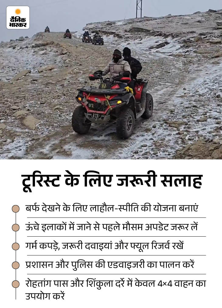 - शिंकुला दर्रा मनाली से 130 किमी दूर: शिंकुला दर्रा लाहौल को जांस्कर घाटी से जोड़ता है और यहां भी बर्फ मौजूद है। यह दर्रा मनाली से करीब 130 किलोमीटर दूर और 16,500 फीट की ऊंचाई पर स्थित है। यहां केवल 4×4 वाहनों को ही जाने की अनुमति है, क्योंकि ब्लैक आइस के कारण फिसलन काफी बढ़ गई है। यह इलाका एडवेंचर टूरिस्ट के लिए ज्यादा उपयुक्त माना जाता है।