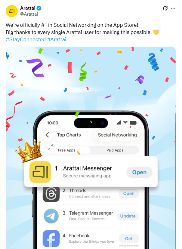 दरअसल, Arattai ने अपने सोशल मीडिया प्लेटफॉर्म पर 27 सितंबर, 2025 को एक पोस्ट किया, ‘आधिकारिक तौर पर हम सोशल नेटवर्किंग में एप स्टोर पर पहले नंबर पर आ गए हैं। हर Arattai यूजर का शुक्रिया, जिन्होंने इसे संभव बनाया है।’