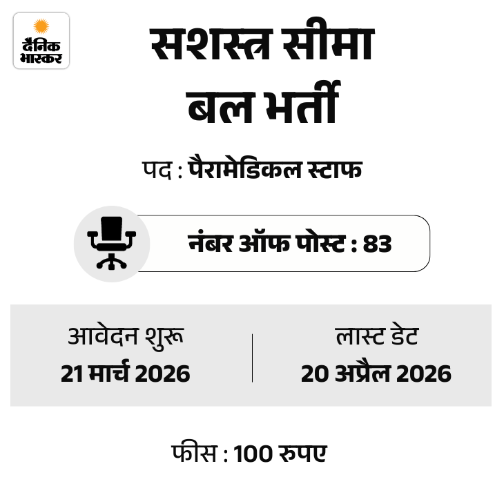 सशस्त्र सीमा बल (एसएसबी) ने पैरा मेडिकल स्टाफ के 83 पदों पर भर्ती निकाली है। उम्मीदवार ऑफिशियल वेबसाइट ssb.gov.in पर जाकर आवेदन कर सकते हैं।