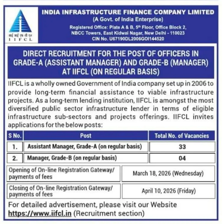 इंडिया इंफ्रास्ट्रक्चर फाइनेंस कंपनी लिमिटेड (आईआईएफसीएल) ने ग्रेड ए (असिस्टेंट मैनेजर) और ग्रेड बी (मैनेजर) के पदों पर भर्ती निकाली है। उम्मीदवार ऑफिशियल वेबसाइट www.iifcl.in पर जाकर आवेदन कर सकते हैं। फीस भुगतान की आखिरी तारीख 10 अप्रैल तय की गई है।