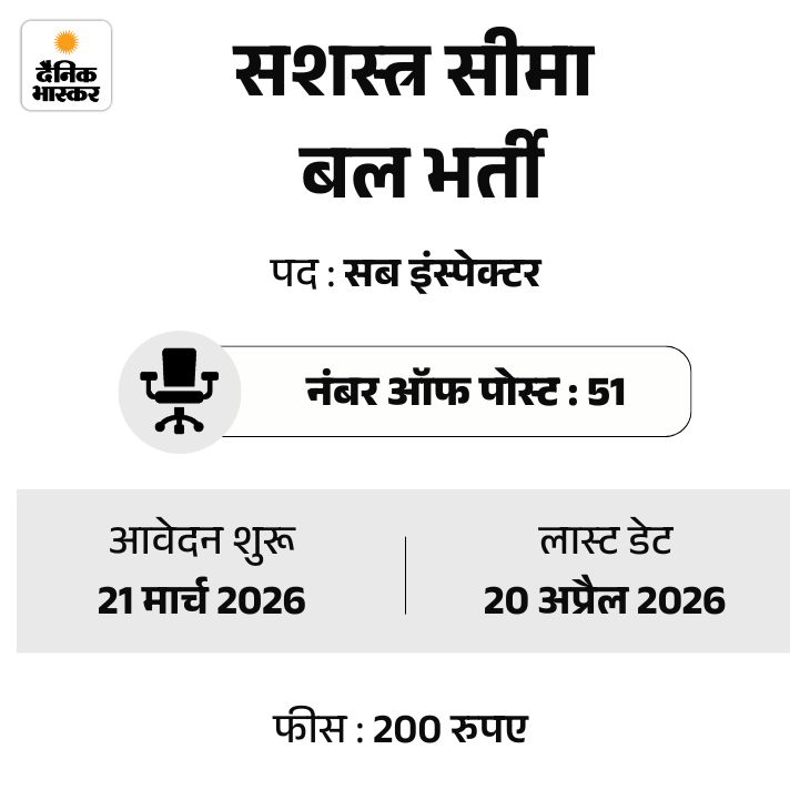 सशस्त्र सीमा बल (एसएसबी) ने सब इंस्पेक्टर के 51 पदों पर भर्ती निकाली है। उम्मीदवार ऑफिशियल वेबसाइट ssb.gov.in पर जाकर आवेदन कर सकते हैं।