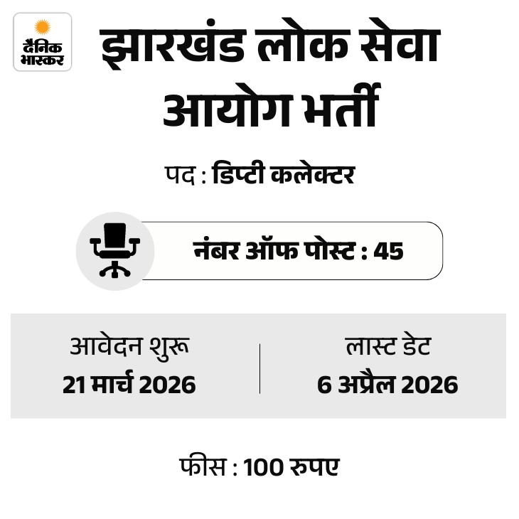झारखंड लोक सेवा आयोग (JPSC) की ओर से डिप्टी कलेक्टर के पदों पर भर्ती का नोटिफिकेशन जारी किया गया है। आवेदन प्रक्रिया की शुरुआत 21 मार्च, 2026 से होगी। उम्मीदवार ऑफिशियल वेबसाइट पर जाकर आवेदन कर सकेंगे। फीस जमा करने की आखिरी तारीख 8 अप्रैल तय की गई है।