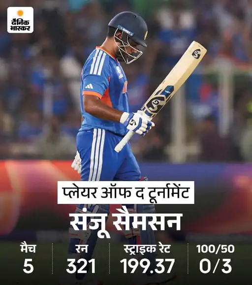 सैमसन को प्लेयर ऑफ द टूर्नामेंट चुना गया भारत के विकेटकीपर बैटर संजू सैमसन भारत के लिए ट्रंप कार्ड साबित हुए। उन्होंने टीम के लिए लगातार 3 मैचों में फिफ्टी लगाई। सैमसन ने बैटिंग के लिए चैलेंजिंग पिच पर नाबाद 97 रनों की पारी खेलकर भारत को फाइटिंग टोटल तक पहुंचाया। इतना ही नहीं, सेमीफाइनल में इंग्लैंड के खिलाफ और फाइनल में न्यूजीलैंड के खिलाफ 89-89 रनों की पारी खेली। वे इस टूर्नामेंट में भारत के टॉप स्कोरर रहे। उन्हें प्लेयर ऑफ द टूर्नामेंट चुना गया।