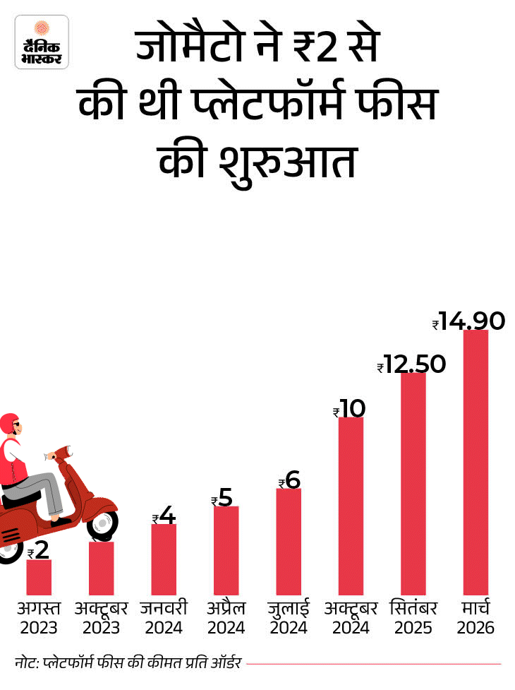 कंपनी ने 7 महीने में दूसरी बार प्लेटफॉर्म फीस बढ़ाई है। इससे पहले अगस्त-2025 में 17% यानी 2 रुपए का इजाफा किया गया था। तब प्लेटफॉर्म फीस 12 रुपए से बढ़कर 14 रुपए हो गई थी।