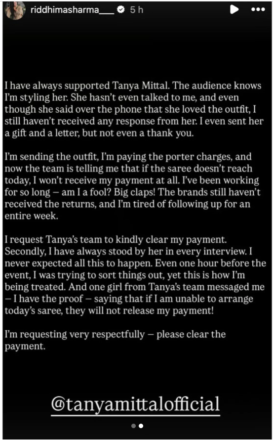 रिद्धिमा ने आगे लिखा, दूसरी बात मैंने हर इंटरव्यू में हमेशा उनका साथ दिया है। मुझे कभी उम्मीद नहीं थी कि ऐसा होगा। इवेंट से एक घंटा पहले तक मैं सब कुछ ठीक करने की कोशिश कर रही थी, फिर भी मेरे साथ ऐसा बर्ताव किया जा रहा है। और तान्या की टीम की एक लड़की ने मुझे मैसेज किया मेरे पास सबूत है कि अगर मैं आज की साड़ी का इंतजाम नहीं कर पाई, तो वे मेरा पेमेंट नहीं करेंगे। मैं आपसे बहुत विनम्रता से अनुरोध करती हूं – कृपया पेमेंट कर दीजिए।