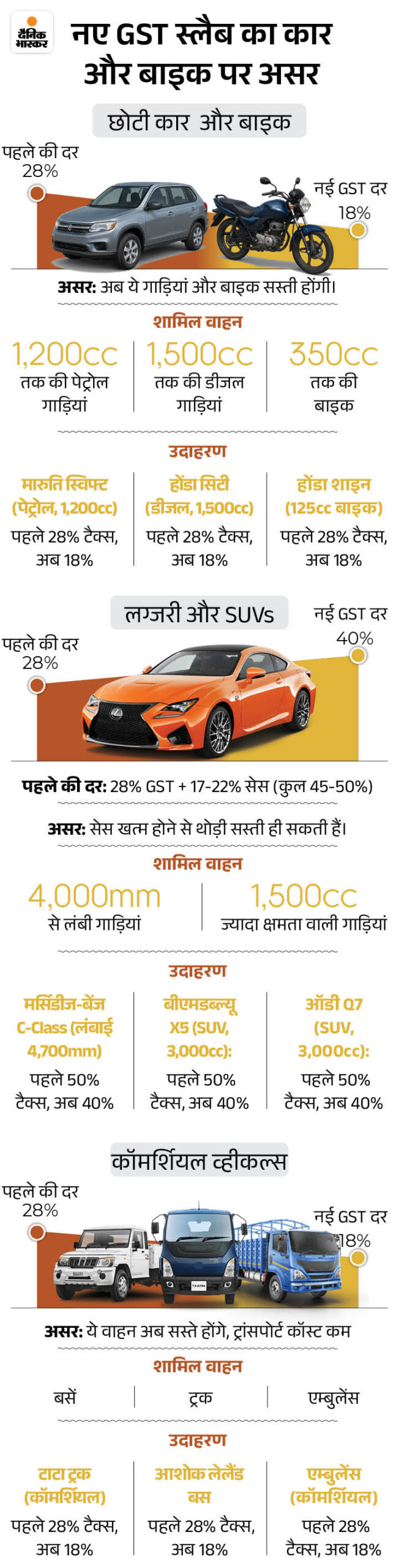 - इसके अलावा 350cc तक की बाइक जैसे होंडा शाइन, एक्टिवा भी सस्ती हो जाएंगी। कॉमर्शियल व्हीकल्स जैसे बसें, ट्रक और एम्बुलेंस भी 28% से घटकर 18% GST के दायरे में आ गए हैं।