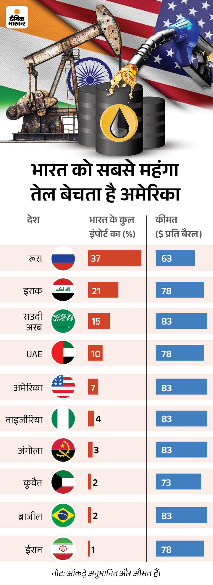 • अमेरिका: जनवरी-जून 2025 में भारत ने अमेरिका से रोजाना 2.71 लाख बैरल तेल इम्पोर्ट किया, जो पिछले से दोगुना है। जुलाई 2025 में अमेरिका की हिस्सेदारी भारत के तेल आयात में 7% तक पहुंच गई।
