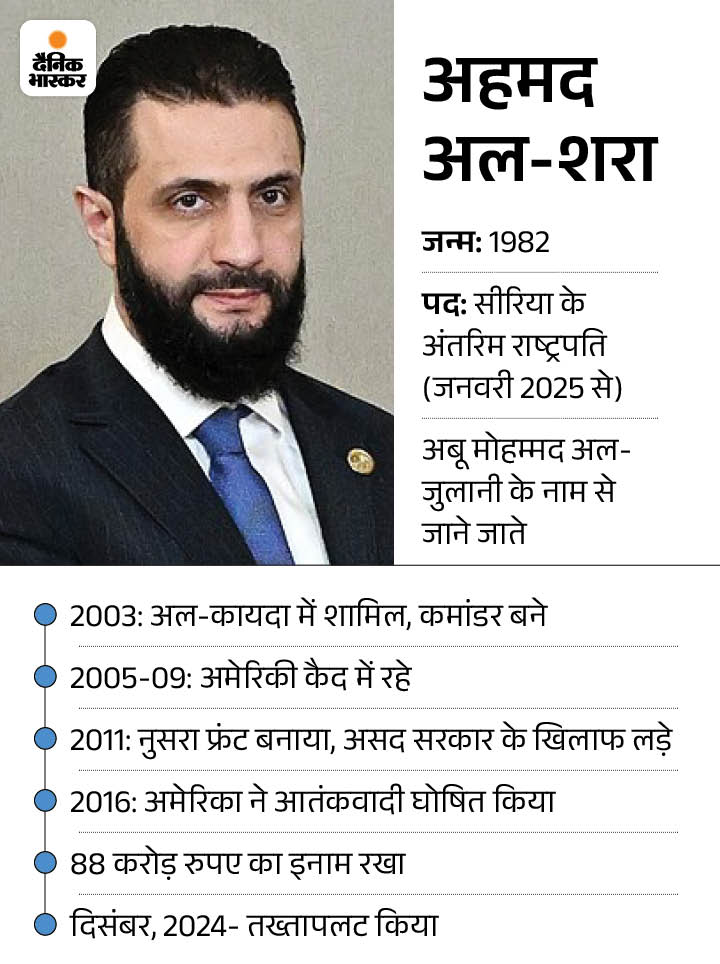 अलकायदा से जुड़े अल-शरा को अमेरिका ने 2013 में आतंकी घोषित किया था। उन पर 10 मिलियन डॉलर यानी लगभग 84 करोड़ रुपए का इनाम था। अल-शरा ने पिछले साल दिसंबर में सीरिया में तख्तापलट किया था। वे इस साल 29 जनवरी को सीरिया के अंतरिम राष्ट्रपति बने।