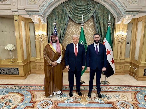 ट्रम्प के साथ सीरिया के राष्ट्रपति अहमद अल-शरा (दाएं)। इस मुलाकात के दौरान सऊदी के क्राउन प्रिंस मोहम्मद बिन सलमान (बाएं) भी मौजूद थे।