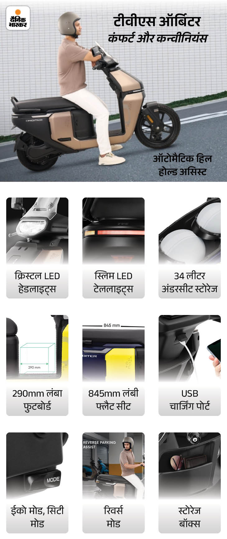 यह अब टीवीएस का सबसे किफायती ई-स्कूटर है। ऑर्बिटर की बुकिंग ऑनलाइन शुरू कर दी गई है और इसे 6 कलर ऑप्शन के साथ पेश किया गया है। इसका मुकाबला एथर रिज्टा, बजाज चेतक और ओला S1 X के बेस वैरिएंट से रहेगा। टीवीएस ने इस स्कूटर में क्रूज कंट्रोल, हिल होल्ड फंक्शन और रिवर्स पार्किंग असिस्ट जैसे कई फीचर्स दिए हैं। टीवीएस ऑर्बिटर पर 3 साल और 50,000km की वारंटी मिलेगी।