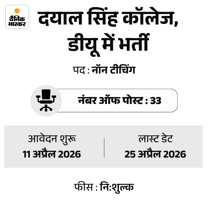 दयाल सिंह कॉलेज (दिल्ली यूनिवर्सिटी) की तरफ से नॉन-टीचिंग पदों पर भर्ती का नोटिफिकेशन जारी किया गया है। इस भर्ती के लिए आवेदन की आखिरी तारीख 25 अप्रैल है। उम्मीदवारों को ऑफलाइन आवेदन करना होगा।
