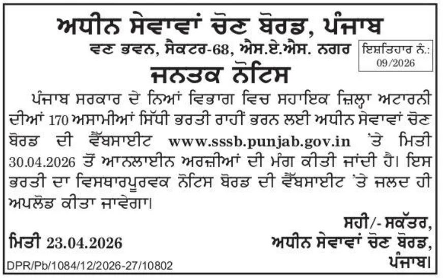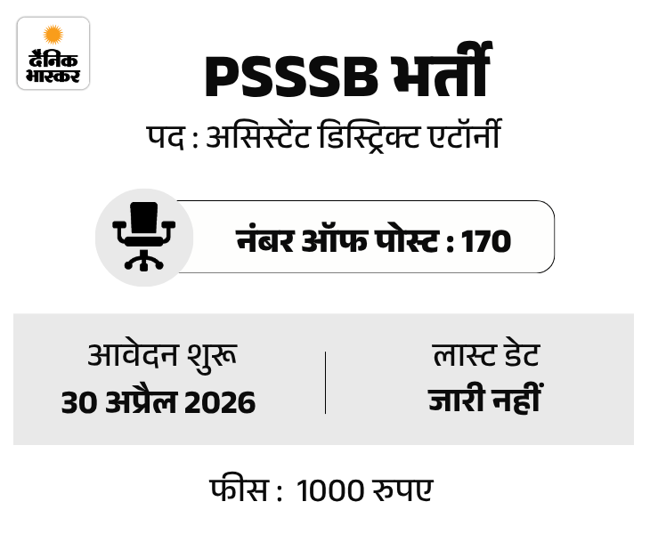 PSSSB की ओर से असिस्टेंट डिस्ट्रिक्ट एटॉर्नी के पदों पर भर्ती निकली है। उम्मीदवार ऑफिशियल वेबसाइट www.pspcl.in पर जाकर आवेदन कर सकते हैं।