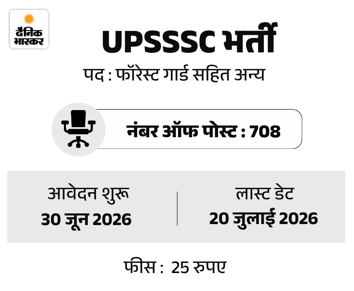 उत्तर प्रदेश फॉरेस्ट डिपार्टमेंट में फॉरेस्ट गार्ड और वन्य जीव रक्षक (वाइल्ड लाइफ गार्ड) के 708 पदों पर भर्ती का नोटिफिकेशन जारी किया गया है। इस भर्ती के लिए एग्जाम फीस 30 जून से 20 जुलाई 2026 तक जमा की जा सकेगी। फॉर्म में करेक्शन के लिए 27 जुलाई तक का समय दिया जाएगा।