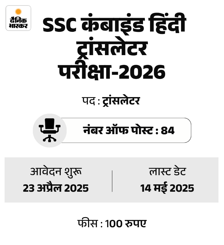 कर्मचारी चयन आयोग (SSC) की ओर से कंबाइड हिंदी ट्रांसलेटर परीक्षा-2026 के लिए आवेदन शुरू हो गए हैं। उम्मीदवार ऑफिशियल वेबसाइट ssc.gov.in पर जाकर अप्लाई कर सकते हैं। उम्मीदवारों को 19 और 20 मई के बीच अपने फॉर्म में करेक्शन का मौका दिया जाएगा।