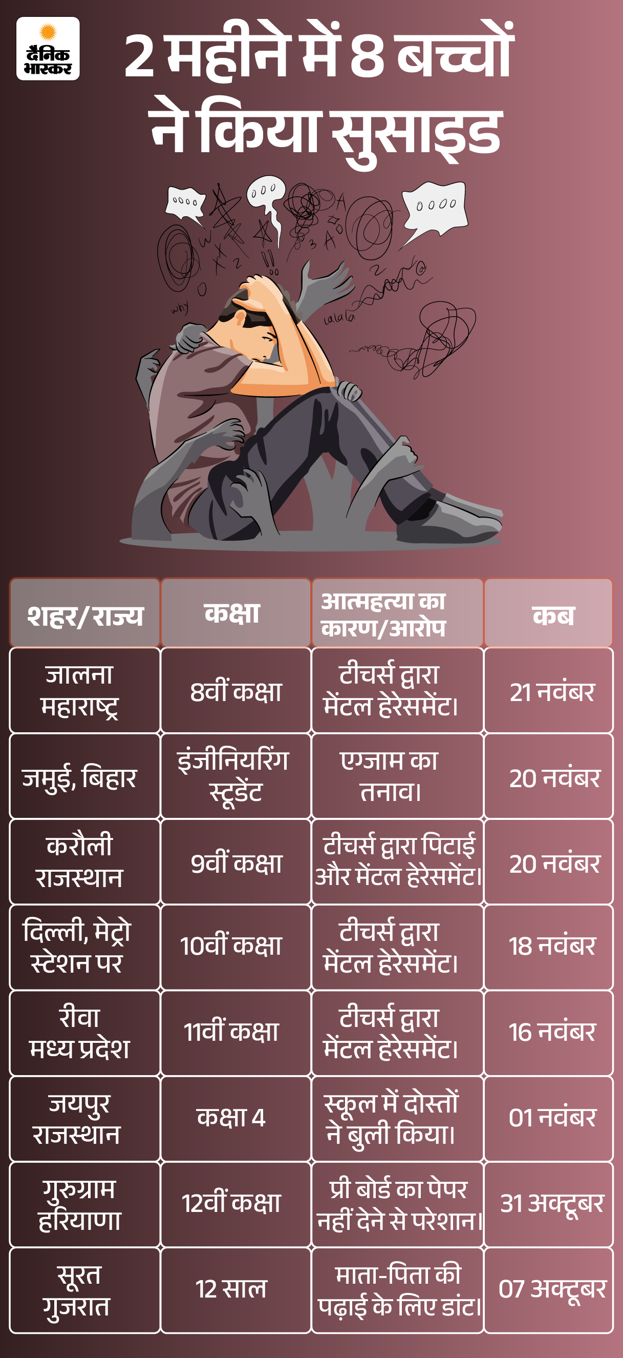 18 नवंबर को भी नई दिल्ली में 16 साल के शौर्य ने स्कूल में मेंटल टॉर्चर के बाद मेट्रो स्टेशन से कूदकर सुसाइड किया था।