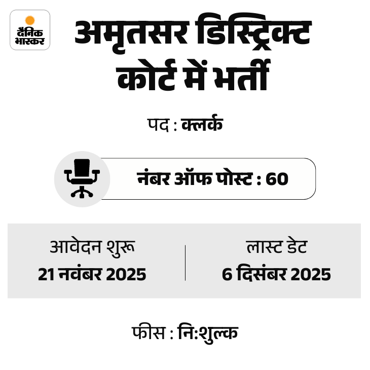 अमृतसर डिस्ट्रिक्ट कोर्ट में 60 पदों पर भर्ती निकली है। उम्मीदवारों को ऑफलाइन आवेदन करना होगा। यह भर्ती एडॉक बेसिस पर की जाएगी।