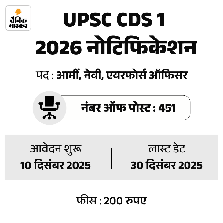UPSC ने CDS I परीक्षा 2025 का नोटिफिकेशन जारी कर दिया है। उम्मीदवार यूपीएससी की ऑफिशियल वेबसाइट upsconline.nic.in या upsc.gov.in पर जाकर आवेदन कर सकते हैं। सिलेक्ट किए गए उम्मीदवारों को जनवरी-अप्रैल 2027 से शुरू होने वाले कोर्स में शामिल किया जाएगा। फीस जमा करने की आखिरी तारीख 30 दिसंबर तय की गई है।