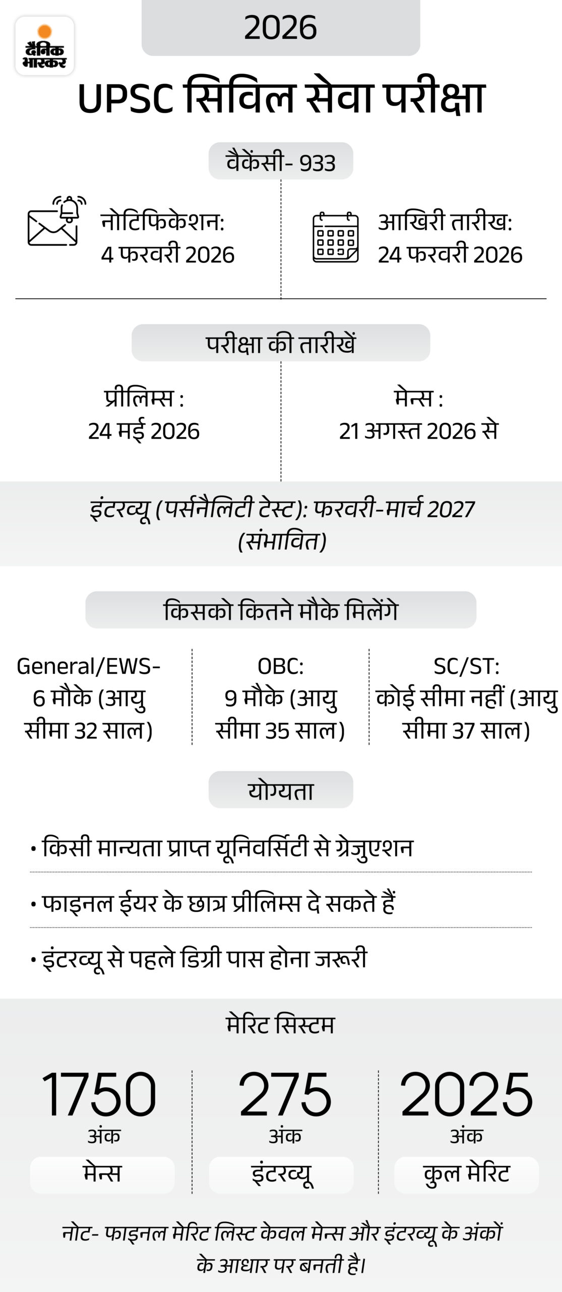 संघ लोकसेवा आयोग (यूपीएससी) ने सिविल सेवा परीक्षा 2026 का नोटिफिकेशन बुधवार को जारी किया है। आयोग ने इस बार 933 पदों के लिए भर्ती विज्ञापन जारी किया है। आवेदन की आखिरी तारीख 24 फरवरी है।